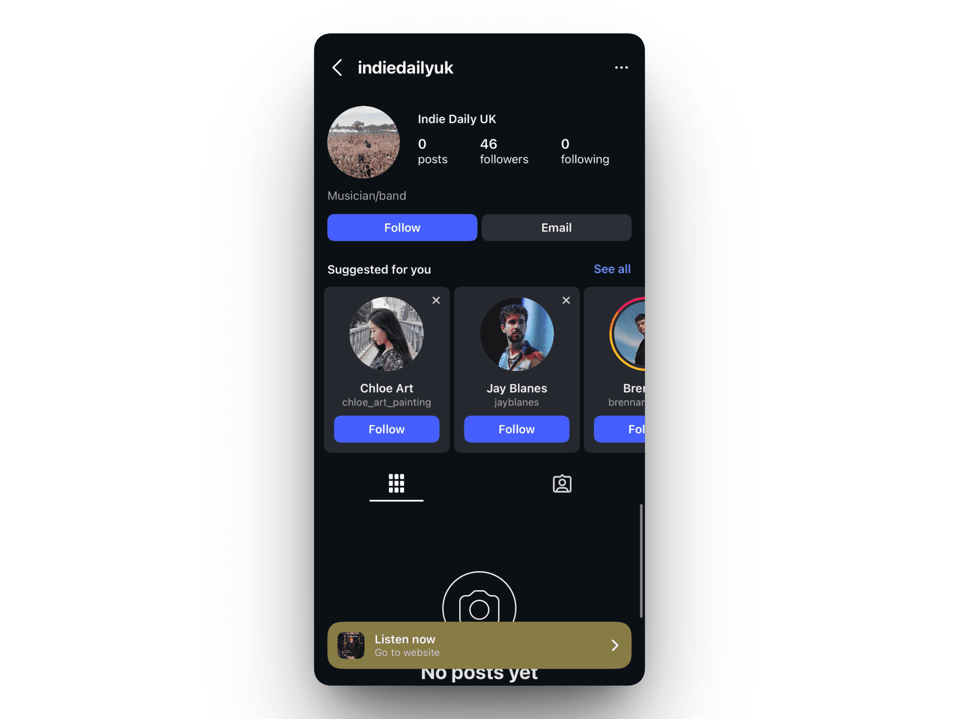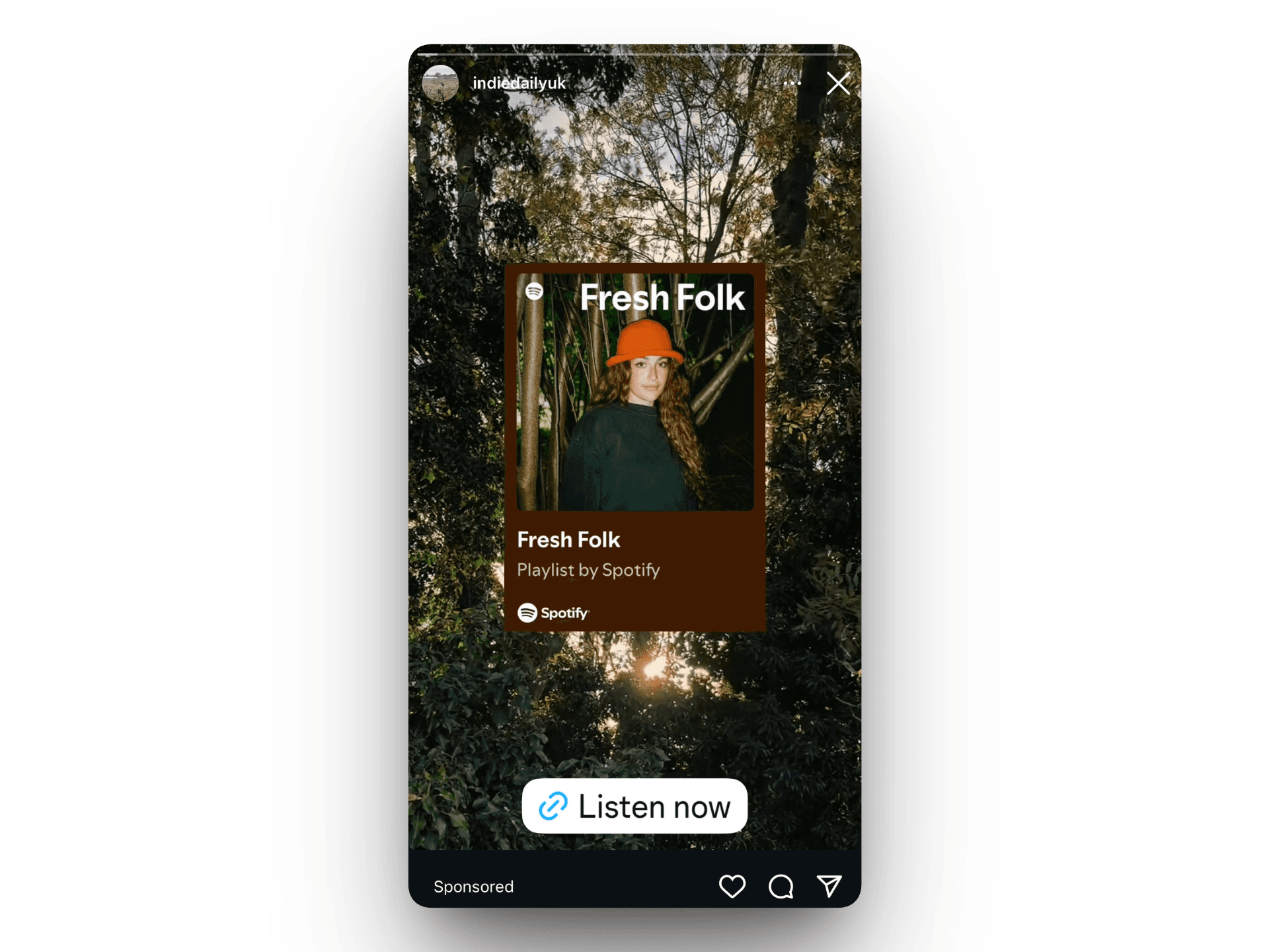The Strategy: We found an account called indiedailyuk running ads for the Fresh Folk editorial playlist. This account has zero posts and almost no followers. It’s a "mock" account.